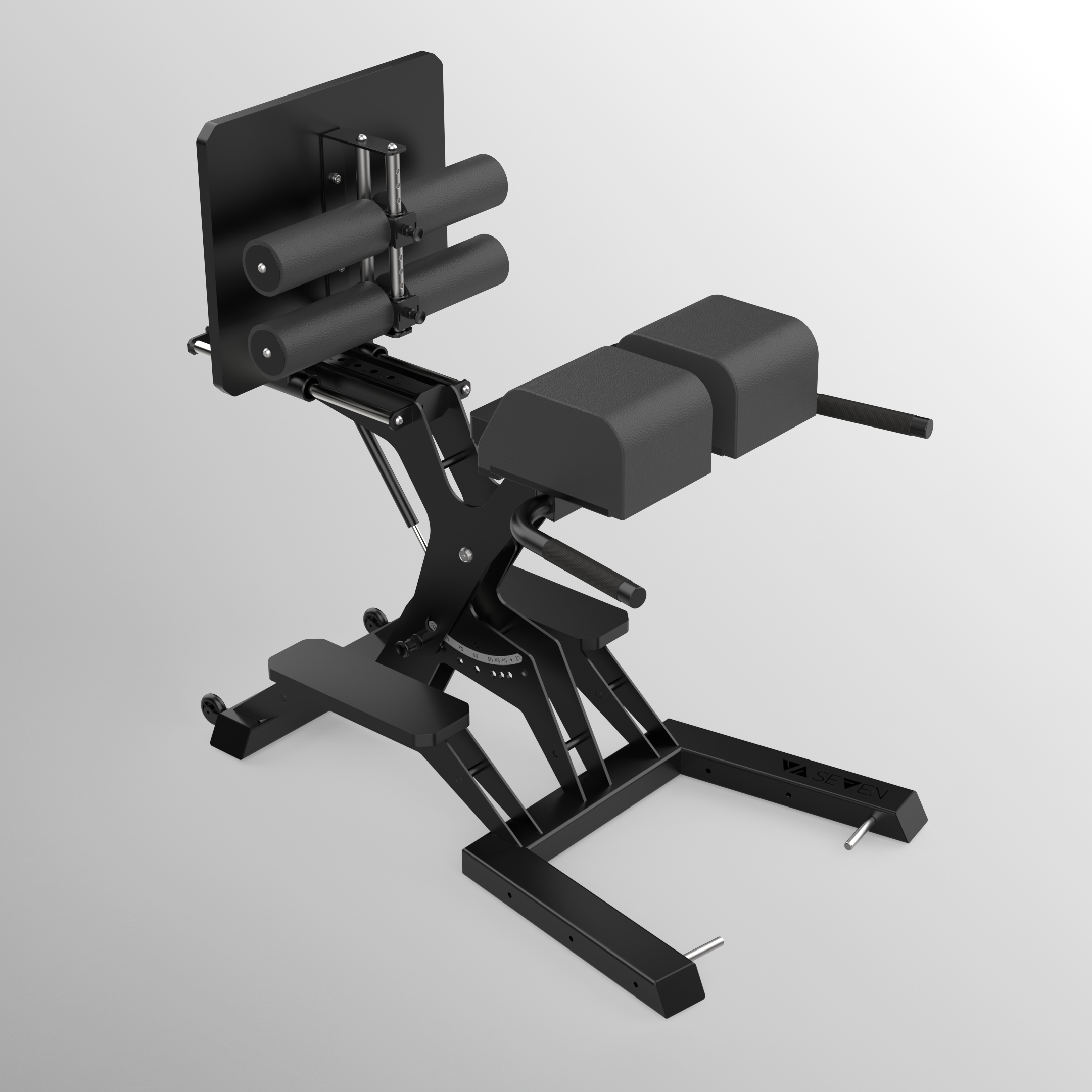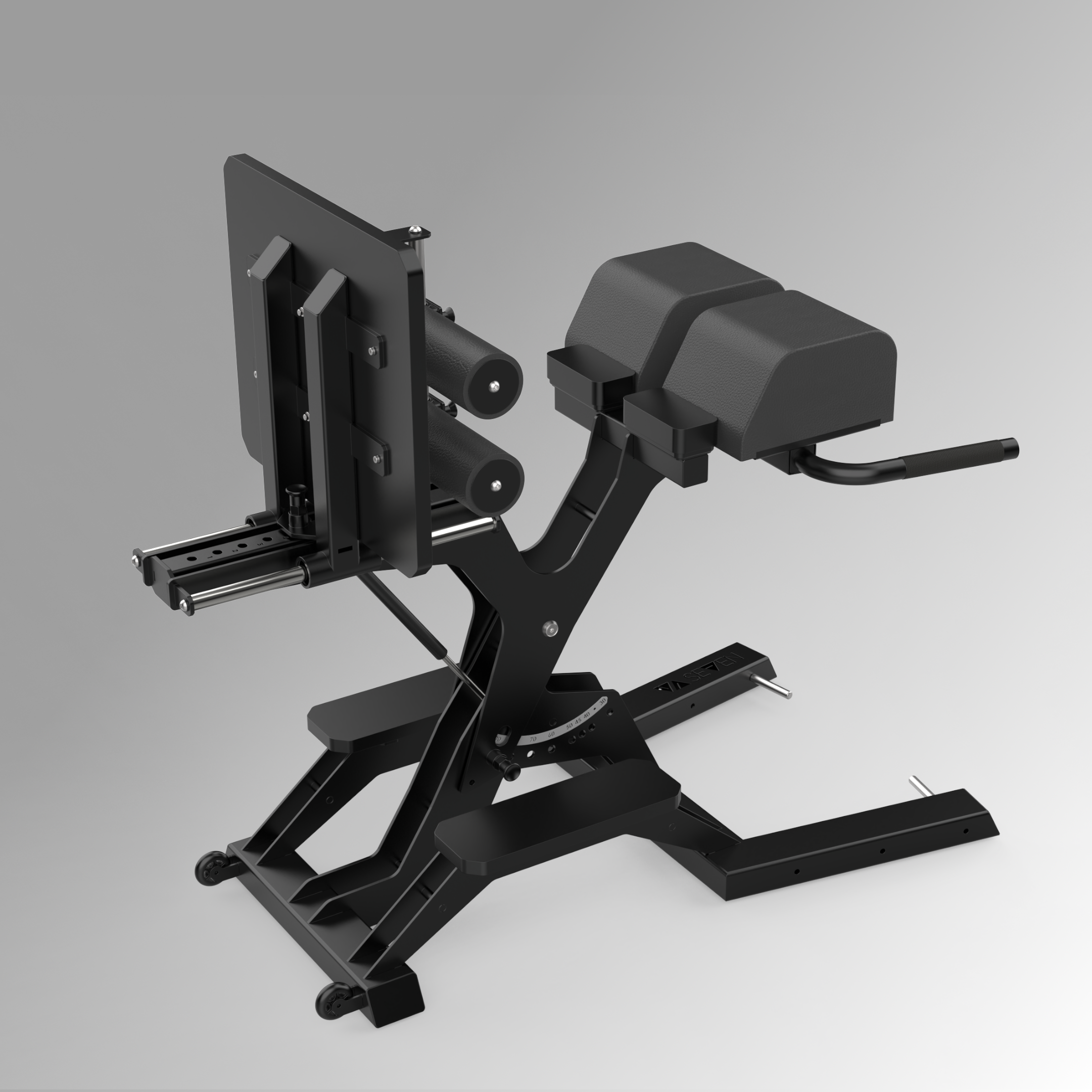Die Verwandlung von Glute Ham Developer zu Hyper Extension erfolgt dank Gasdruckfeder einfach und schnell. Bei der Winkeleinstellung stehen Ihnen folgende Möglichkeiten zur Verfügung: 30°, 40°, 45°, 50°, 60°, 70°, 80° und 90°.